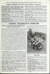 | Keywords: The wonderful new rose hoosier beauty (16202904087).jpg ELLA V BAINES THE WOMAN FLORIST SPRINGFIELD OHIO <br> 37 <br> HARDY BORDER PLANTS AND BULBS Concluded <br> PLUMBAGO LABPENTAE or Lady Larpent Deep <br> royal blue flowers This is an elegant plant 10 cts <br> HARDY SCOTCH or SWEET MAY PINKS These <br> are the pinks of our mothers' gardens; all colors <br> 10 cents; three distinct colors for 25 cents <br> NEW HARDY SCOTCH PINK HER MAJESTY <br> Pure white flowers; fine for cemetery 10 cents; <br> three for 25 cents <br> PLATYCODON GRANDIFLORUM Bush Clematis <br> A free-flowering plant covered with flowers <br> that resemble somewhat the Clematis; two colors <br> deep blue and pure white 10 cents each; the <br> two for 15 cents <br> PYRETHRUM Handsome garden flowers like huge <br> daisies 15 cents <br> RUDBECKIA LACINIATA Golden Glow Grows <br> six to eight feet high bearing hundreds of double <br> yellow blossoms; it is very desirable 10 cents; <br> three for 25 cents <br> RUDBECKIA PURPUREA The great purple cone <br> flower 25 cents <br> SAGE HOLT'S MAMMOTH A variety of unusual <br> substance strong flavor and superior quality 10 <br> cents; three for 25 cents <br> STOKESIA CYANEA or CORNFLOWER ASTER <br> Grows eighteen to twenty-four inches high Two <br> kinds of flowers of lavender-blue and pure white <br> four to five inches in diameter borne from June <br> to October 15 cents; two for 25 cents <br> HARDY BLUE SALVIA Caryopteris Mastacanthus <br> A grand plant bearing rich lavender-blue flow- <br> ers Be sure and try this plant It will please <br> you 10 cents <br> SWEET WILLIAM A Pine Collection of all Colors <br> - White scarlet maroon pink red on white <br> ground violet on white ground Holborn Glory or <br> Auricula-flowered 10 cents; three for 25 cents; <br> seven for 50 cents <br> VALERIANA- Garden Heliotrope Entirely hardy <br> very showy plant; lavender flowers; very fra- <br> grant 15 cents <br> VIOLET HARDY DOUBLE ENGLISH A perfectly <br> hardy double Violet; a beautiful blue color 20 <br> cents; three for 50 cents <br> YUCCA FILA3IENTOSA Spanish Dagger Blooms <br> every year bearing long stalks surmounted with <br> large umbels or heads of white flowers 10 cents <br> HARDY DECIDUOUS SHRUBS <br> The Ever Blooming Butterfly Bush <br> Buddleya Variabilis Magnifica <br> It was a matter of some thought before this highly <br> desirable plant was finally christened with the common <br> English name by which it goes Several years ago there <br> were imported from Europe some plant novelties and this <br> one was among them We observed it carefully for a <br> season and were charmed with its beauty ease of culture <br> and free flowering habit The name Butterfly Bush was <br> applied to it because it seems to attract butterfles in <br> large numbers Particularly we notice that it is not alone <br> the common little yellow species of butterfly but also the <br> large and gorgeously colored butterflies that swarm about <br> it as though vieing with it in brilliancy of color This <br> shrub from a young plant set out either in the spring or <br> fall will mature to full size the first summer producing <br> a handsome bush which the first year often maintains a <br> height of four feet It produces long graceful stems <br> which terminate in tapering panicles of beautiful lilac- <br> colored flowers that are of miniature size and borne by <br> the hundreds on a flower head which is frequently ten <br> inches long A single plant the first season will throw <br> out as many as fifty flower spikes -which increase greatly <br> in number during succeeding years The year after plant- <br> ing it generally commences to flower in June and con- <br> tinuing each season until severe frosts nip it The foliage <br> and blooms are exceedingly fine The shrub is rather <br> semi-herbaceous by which we mean in some latitudes it <br> will die down to the ground and while perfectly hardy <br> we recommend covering the roots with manure leaves or <br> other suitable materials as winter approaches as this will <br> produce a heavy growth the following season This shrub <br> is very desirable as an individual specimen in the lawn <br> and garden or placed promiscuously in the shrubbery <br> border Pine plants 20 cents; three for 50 cents <br> AZALEA MOLLIS The most brilliant and showy of all <br> hardy shrubs exceeding even the Rhododendron and <br> entirely hardy without protection in all situations The <br> bloom which varies in color from the intense rosy- <br> crimson to lemon-yellow literally covers the compact <br> spreading plant forming a huge bouquet and which <br> remains in perfection for a long time in Mav and June <br> Massed they produce an effect that is actually brilliant <br> and dazzling These plants ready to bloom 50 cents <br> BUXUS Ornamental Box Sempervirens Useful for <br> edging and bordering walks etc A handsome shrub <br> with deep green foliage This is not as dwarf as the <br> Sempervirens Nana but we find it so much more vigor- <br> ous and hardy that we advise planting this and trim- <br> ming to height required 5 cents each; 50 cents per <br> dozen postpaid By express purchaser to pay ex- <br> pressage 3 00 per hundred <br> CALYCANTHUS PLORIDUS Carolina Allspice or Sweet <br> Scented Shrub A most desirable shrub The wood is <br> fragrant; flowers of a rare chocolate color having a <br> peculiar agreeable odor that is very penetrating Thev <br> blossom in June and at intervals afterwards ' Pine <br> plants 15 cents; strong two-year-old plants 35 cents <br> CYDONIA JAPONICA Japan Quince Has bright scarlet <br> flowers in great profusion in early spring; one of the <br> best shrubs Pine plants 25 cents <br> FORSYTHIA VIRroiSSIMA A fine hardv shrub leaves <br> and bark deep green; flowers golden-vellow Blooms <br> earliest of all shrubs before the foliage comes 20 <br> cents; two-year size 40 cents <br> Buddleya Variabilis Magnifica Butterfly Bush <br> Deutzias <br> 