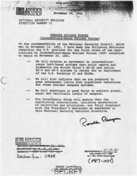 | Keywords: Theater Nuclear Forces - NARA - 198179.jpg Scope and content General notes 198179 Local identifier President 1981-1989 Reagan National Security Council 1981 - 1989 Ronald Reagan Library NLRR 40 Presidential Drive Simi Valley CA 93065-0600 date 1981 11 16 Record group Collection RR-NSC Numbered National Security Policy Papers 1981 - 1989 Record group ARC 1189 National Security Decision Directives compiled 02/25/1981 - 01/19/1989 Series ARC 198166 File unit File unit ARC Variant control numbers NAIL Control Number NLS-NSC-NSDD-15 Other versions <gallery> File Theater_Nuclear_Forces_-_NARA_-_198179 tif tif File Theater_Nuclear_Forces_-_NARA_-_198179 jpg jpg </gallery> NARA-cooperation PD-USGov Presidential Decision Directives Reagan |
