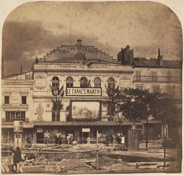 | Keywords: Théâtre de la Gaité, Boulevard du Temple, Paris, ca. 1855.jpg The Théâtre de la Gaité was built in 1835 on the site of an earlier structure of the same name that burned in February of that year It was one of a row of theaters cheek by jowl along the Boulevard du Temple that was demolished in 1862 as part of Haussmann's reconfiguration of the city making way for the Place du Château d'Eau Dubeuty and Cormon's melodrama Le Canal Saint-Martin opened at the Gaité on July 12 1845 and long enjoyed immense popularity ca 1855 Albumen silver print from glass negative 19 1 x 20 1 cm 7 1/2 x 7 15/16 in irregular Institution Metropolitan Museum of Art object history exhibition history credit line Gift of Pierre Apraxine in memory of Hughes Autexier and François Braunschweig 1996 281942 Inscription Inscribed in pencil on verso BRC 82010823225 accession number 1996 526 PD-100 Images of Paris from the Metropolitan Museum of Art Photographs in the Metropolitan Museum of Art Théâtre de la Gaîté boulevard du Temple Boulevard du Temple Paris 1855 in Paris 1855 photographs Eugène Cormon Valued images of Paris Théâtre de la Gaité Boulevard du Temple Paris ca 1855 12 21 7 December 2013 UTC Théâtre de la Gaité Boulevard du Temple Paris ca 1855 jpg |