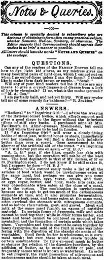 | Keywords: TheFamilyDoctorAug24 1889page410.png <center>Notes Queries <br>- 0 -</center> This column is specially devoted to subscribers who are desirous of obtaining information on any practical subject whether Domestic Medical Sanitary or otherwise The wishes in as brief a manner as possible Al letters should have the words Notes Queries on the envelope <center>QUESTIONS </center> Can any of-the readers of the FAMILY DOCTOR tell me how to dye light kid gloves as my mistress gives me many beautiful pairs of light ones which I cannot put on when I go out-of-doors unless loan dye them I should like to make them dark brown or purple -- Sarah Will any of your kind readers tell me if there are any means to give a correct diagnosis of disease from a lock of hair by chemicals If so what is the modus operandi -- M A Cox I am partially bald and not yet thirty Will any reader tell me of some remedy for baldness -- R Jenkins <center>ANSWERS </center> Rational to Inquiring Girl --I advise the wearing of the Rational corset bodice which affords support and gives a good shape to the figure without the injurious effects of stiff stay busks I purchased mine at Mrs Fanlkner's St Anne's-passage Manchester but could not tell where they are to be had in London If An Inquiring Girl will wear a closely-fitting bodice of stout jean without bones or steels immediately over her chemise she will find a dress look infinitely better than over a corset Once accustomed to the absence of the artificial aid of the corset An Inquiring Girl will never put one on again -- H B J A L B may if she likes scarify her skin with pumice-stone but the operation will not be of the least use The beet depilatory is that of Mr Sellers of 57 or 59 Farringdon-road I do not know if he still makes it but I suppose he does -- H B J Ariadne -We cannot easily make a list of all the articles of food which would be unwholesome eaten at the same meal but perhaps we can give you some idea For instance eggs sigar cream and flour or eggs sugar butter and flour made into cake are very objectionable when eaten a t the close of a meal as is the custom The combination is unwholesome because one is apt to get too much of the carbonaceous elements at once; and it also promotes fermentation Eggs beefsteak peas and beans eaten at the same meal often overload the stomach with nitrogenous elements and so induce rheumatism gout and gravel Meat and milk at the same meal furnish an excess of nutritive material In certain forms of dyspepsia milk and acids cannot be used together ; while in other forms butter and meat and bread cannot be combined on account of fermentation and the formation of certain acids which takes place Vegetables and fruits cannot be eaten together by many dyspeptics the acid of the fruit in some way interfering with the digestion of the starchy elements of the vegetables Good fresh butter is wholesome so is corn-meal mush; but even these would create trouble in certain combinations To fry c'lrn-meal mush in butter so changes the relation of the digestive functions by the addition of butter as to create acidity or pain and frequently causes what is known as waterbrash In order to eat properly the right proportion of nitrogenous and carbonaceous matter should be taken at each meal To Inguiring girl ; from Rational ; from H B J PD-Art Tightlacing The Family Doctor 1889 Artworks missing infobox template |