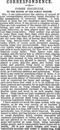 | Keywords: TheFamilyDoctorAug31 1889page9.png <center>CORRESPONDENCE -- 0 -- CORSET DISCIPLINE TO THE EDITOR OF THE FAMILY DOCTOR </center> SIR -I can quite endorse the opinion of several of your correspondents advocating corset discipline in the management of refractory children A lady friend of mine has two daughters aged fifteen and sixteen with whom it has proved a complete success They are both members of the tennis club to which I belong and used to be much remarked by their rough behaviour as they played more like schoolboys than young ladies Their mother was advised to make them wear their stays while they played instead of leaving them off as they usually did; but she did more than this by having them fitted with very long heavily-boned stays with stiff broad busks which of course quite prevented stooping besides being very uncomfortable They were laced very tightly when they next appeared and I never saw girls so much improved for they were now wellbehaved young ladies Their figures were slimwaisted and the lacing was so effective that playing or sitting they were obliged to keep erect Their hands were encased in long well-fitting kid gloves which they were not allowed to remove They now played a quiet lady-like game and looked very pretty and graceful being laced so tightly that ungainly movements were impossible Their mother says she finds this means of restraint is very beneficial as it enforces patience and submission When there is any need for punishing either of them it is easily done by tightening the culprit's lace so as to entail an extra degree of discomfort as discipline as well as improving her figure and carriage These girls never know now what it is to be without constant pressure and restraint for at night their already slender waists on being released from their day orsets are immediately enclosed in others having flexible busks and laced in an inch smaller than before Their hands are kept constantly gloved both day and night in very tight kid and fastened by bracelets to prevent them being removed and are becoming beautifully white in consequence I have carried out much the same system with my stepson as he was very unruly so at fourteen I subjected him to the régime of the stay-lace and confined him in a long stiff corset which I tightened periodically but of course never removed He soon ceased to rebel and has become a submis-sive subject to corset discipline which renders impossible all unseemly indulgence of lolling about As his stays are not allowed to be loosened he has to exercise great'self-control at meal times being naturally rather greedy and is consequently much improved in health He is now nearly sixteen and wears a beautifully-moulded stiff corset 17 inches long with Tightlacing The Family Doctor 1889 Image TheFamilyDoctorAug31_1889page10 png from Finished Figure; from Old-Fashioned PD-Art Artworks missing infobox template |