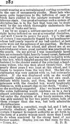 | Keywords: TheFamilyDoctorJune29 1889page282.png CORSET DISCIPLINE TO THE EDITOR OF THE FAMILY DOCTOR SIR --Like your correspondent Science and Art I am an ardent admirer of a very small waist and I fully agree with him that the fact of its having to be produced by tight lacing only adds to its charm Curiously enough as a coincidence exactly the same principle is enunciated in the letter in the same number from Ringlock who speaking of earrings for ladies and the opinion of some people that piercing the ears is barbarous most happily observes that it is just this little bit of barbarousness which gives the earring its piquancy considered apart from its gracefulness This is emphatically true and it is to this delightful piquancy that is due the perpetuation of certain modes whilst others which are elegant only pass away as quickly as those which spring from some passing caprice There is no more piquant charm than that of a fashionably-booted foot A well made dainty boot is exquisitely pretty but had it this recommendation only the style would change incessantly as it does now in certain particulars; whereas the high heel and narrow toe have a power which keeps their charm fresh from year to year however much the ideas of Madame La Mode may vary as to material colour and so on The stylish heel imparts an attractive poise to the foot which nothing can equal whilst the narrow roguish toe also is infinitely smart It likewise is an element of smartness Everyone knows how vastly superior is the witchery of a kid glove for being so tight that it seems like a skin that by some magic is prevented from contracting the least vestige of crease or wrinkle And it is just the same with a pretty boot With a slovenly carriage a thick waist and bad boots and gloves the most expensive toilette may appear dowdy in the extreme; whilst a comparatively simple and cheap dress will look wonderfully smart upon a well-corseted figure whose owner is well set-up and who attends to the important details of dressing her hands and her feet in the nattiest manner Such being my view of dress it of course follows naturally that I am a great advocate of giving girls the advantage of frequent drilling and dancing lessons and of insisting upon every requirement of the instructor being met with accuracy and precision Most girls require some standing in the stocks to make them turn out their feet equally and also to accustom them to sit or stand without shuffling their feet about An occasional movement is of course well enough and desirable but constant shuffling and shifting must be rigorously put down The backboard and collar should be used regularly to ensure a good carriage the collar being sometimes used at a very high level indeed; and girls should be accustomed to perform their drill thus whenever required Although I have never been through any personal experiences of these things myself I have had ample opportunities of observing their effects in the person of my wife who had only just before our marriage now five years ago left at the age of nineteen a very strict finishing school where all means were adopted such as those I have referred to for securing to the girls the most elegant and fashionable appearance possib1e Every day there was either a dancing or a drilling lesson and every day the backboard and collar were worn for at least an hour and often for two or three hours The stocks were the certain fate of any girl who had to be twice spoken to as to her feet The corsets were of course of the best and stiffest and laced extremely tight and the chaussure and gloves always of the best and most fashionable To improve the hands it was the invariable rule that every girl slept in her gloves and also that she never went out of the house without them One rule which was no doubt a severe one certainly operated with great success This was to invariably punish any girl who under any circumstances got her gloves or boots soiled and dirty The result was that In time the girls acquired under this dispensation the power commonly supposed to be the special property of Frenchwomen of doing anything without getting glove or boot soiled in the least To this day I often marvel after one of our long walks how it is that my wife has contrived to traverse any quantity of muddy pavement without getting a speck on either boot The health of the girls at her school was excellent and notwithstanding her waist is still but 20 inches when corseted although 27 inches would be nearer the mark when free she has never had a moment's ill-health since I have known her I hope we may soon now have the promised further letter from Carl who deserves great credit for the care taken With his daughters When Moderation last wrote she told us she should be particulal1y careful to be well corseted and shoed on the occasion of her marriage It would be very interesting now if her husband Science and Art would tell us what was the size of her waist and would accurately describe her chaussure both at the ceremony and for the going away Could we also hear what are her views as to gloves -- Yours c RAYMOND Gloves Tightlacing The Family Doctor 1889 Image TheFamilyDoctorJune29_1889page281 png from R D B PD-Art Artworks missing infobox template |