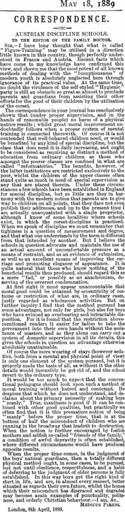 | Keywords: TheFamilyDoctorMay18 1889page184.png CORRESPONDENCE -- 0 -- AUSTRIAN DISCIPLINE SCHOOLS TO THE EDITOR OF THE FAMILY DOCTOR SIR --I have long thought that what is called Figure-Training may be utilised in a direction little known in this country though perfectly under-stood in France and Austria Recent facts which have come to my knowledge have confirmed this view and shown me that the most potent of all known methods of dealing with the bumptiousness of modern youth is absolutely neglected here through ignorance of its practical value At the same time no doubt the virulence of the self-styled Hygienic party is still an obstacle so great as almost to preclude parents and guardians from assisting their other efforts for the good of their children by the utilisation of the corset The correspondence in your journal has conclusively shown that under proper supervision and in the hands of reasonable people no harm of a physical nature results; whilst great moral improvement unÂdoubtedly follows when a proper system of mental training is connected therewith Of course it ii not contended that well-behaved children need or would be benefited by any kind of special discipline but the class that does need it is daily increasing and ought to be considered as requiring as distinct a method of education from ordinary children as those who amongst the poorer classes are confined in what are called reformatories The benefits however of the latter institutions are restricted exclusively to the poor whilst the children of the upper classes often stand quite as much in need of special supervision as any that are placed therein Under these circum stances a few schools have been established in England for special discipline but so little are they in harÂmony with the modern notion that parents are to give way to children on all points that they dare not even publish their addresses and up to the present time I am actually unacquainted with a single proprietor although I know of some localities where schools exist in which the corset-discipline is practised 'Vhen we speak of discipline we must remenlber that tightness is a question of measurement and degree and that what one understands by the term is different from that intended by another But I believe the schools in question advocate and maintain the use of an actual amount of uncomfortable pressure as a means of restraint and as an evidence of submission as well as an excellent means of improving the carÂriage and promotinj; elegance of appearance I t is quite natural that those who know nothing of the beneficial results thus produced should regard this aIJ a mere fad or possibly as an anachronism de serving of the severest condemnation At first sight it must appear unaccountable that moral good could be attained by eccentricity of cosÂtume or restriction of what are in ordinary cases justly regarded as wholesome activities But on further inquiry I find that the method pursued has some advantages not only for girls but also for boys who have evinced an overbearing and intractable disÂposition For it is found that the restriction aboveÂmentioned rend en it easier for ladies to take the government into their own hands without the assis tance of masters and as they alone can carry out a system of domestic supervision in all its details this gives the schools in question an advantage otherwise absolutely unattainable Of course the mere wearing of stays however sedative both from a mental and physical point of view is only one element of the system pursued but it is properly made the basis of all as without it the other details would insensibly be got rid of and the school revert to the ordinary type It would be too much to expect that the conven· tional pedagogue should look upon such a method of moral training without hatred and contempt He despises that which he does not understand and de claims about the primary necessity of making boys U manly True nlanliness is good if it can be corn· bined with other good qualities but practically we often find that it is this premature notion of being c manly before the proper time that is at the bottom of half the misconduct of children who are runninj; in the broad way that leadeth to destruction When the notion is further encouraged by foolish mothers and selfish so-called friends of the family a condition of awful depravity is often established where different circumstances would have produced opposite results When the proper time comes in the judgment of the boys' natural guardians then a totally different physical method ought in some cases to be pursued but not until obedience respectfulness and a habit of deferring to the judgment of older persons is fully established In this way boys get the right kind of start in life and are in almost every respect better situated as regards their own future whilst the homes which their misconduct has dis~raced and degraded may become a~ain examples of punctuality politeness and orderly Christian behaviour - I am c ¢ MEDICUS PARENS London 6th April 1889 Tightlacing The Family Doctor 1889 from Medicus Parens PD-Art Artworks missing infobox template |