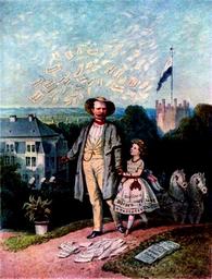| Keywords: Theodor hosemann hermann killisch von horn 1865.png en Painting of Hermann Killisch-Horn 1821 “1886 in 1865 by Theodor Hosemann 1807 “1875 The location of this painting is in Pankow today part of Germany's capital Berlin Hermann Killisch-Horn is shown as 45 year old man walking inside the park of his estate His manor is shown on the left on the right his look-out which reminds of a castle's tower On top of it waves the Prussian flag In the sky surrounding his head are shares/stock of companies while on the grass are issues of the newspaper he founded and owned the Berliner Börsen-Zeitung 1855 “1945 The dress of the young girl also shows the title of this newspaper as she is symbolising the newspaper In other drawings of the founder the newspaper was symbolised by a toddler wrapped in the newspaper de Das Gemälde von Theodor Hosemann 1807 “1875 zeigt den Juristen Journalisten und Unternehmer Hermann Killisch-Horn 1821 “1886 im Jahr 1865 im Alter von 45 Jahren Killisch-Horn ist innerhalb seines Landschaftsgartens abgebildet links sieht man sein Herrenhaus rechts den Aussichtsturm mit gehisster preuĂźischer Flagge Um seinen Kopf herum flattern Aktien diverser Unternehmen im Gras erkennt man Ausgaben der von ihm gegrĂĽndeten Berliner Börsen-Zeitung 1855 “1945 während auf dem Kleid des Mädchens der Name der Zeitung zu erkennen ist In anderen Gemälden und Zeichnungen die den Unternehmer zeigen symbolisiert ein Baby die Zeitung hier ein junges Mädchen 1865 public archive Theodor Hosemann 1807 “1865 other versions PD-old-70-1923 Berlin in the 1860s Paintings of Berlin BĂĽrgerpark Pankow |