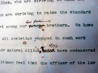 | Keywords: Theodore Roosevelt resignation 005 (correction).jpg This is a closeup of a correction on page five of Theodore Roosevelt's resignation letter to the Mayor of New York ceding his position as President of the New York Police Department on 17 April 1897 The text is digitized at s Resignation letter Roosevelt Scans are taken from an auction of the letter http //cgi ebay com/THEODORE-ROOSEVELT-Letter-of-Resignation-NYPD_W0QQitemZ320000215450QQihZ011QQcategoryZ33776QQrdZ1QQcmdZViewItem non-permanent online page Additional important information regarding source This letter was stolen in 1974 This letter was in the possession of Margaret Daisy Suckley Daisy was confidant to Franklin Roosevelt a sixth cousin and archivist at the Hyde Park Presidential Library This may have been the source of the revised draft letter Daisy gave it to Francis and Mary Crowell Frank Crowell framed the letter and displayed it in his office at his residence at 17 Mill Street in Rhinebeck NY From Francis and Mary Crowell the letter passed to Janet Montgomery Baldwin Janet T Baldwin lived with Frank and Mary From Janet it passed to Anne B Cox daughter of Janet and then to Michael and Charles Cox sons of Anne residing at 3 N Randolph Ave Poughkeepsie NY In 1973 worried about the safety of the letter Michael folded the letter around a piece of cut cardboard and sealed it behind a framed envelope with an uncut pair of black Washington stamps that hung in a frame on the wall of Cox's bedroom The letter with black Washington stamps was posted circa 1850 and written on blue linen paper The letter was between Eugene Lynch and Ogden Lynch ancestors of Francis Crowell concerning their dry-goods and mining supply trade in Coloma CA The Lynch letter and the Roosevelt letter hidden behind it along with other antiquities including original bills of lading from the Flying Cloud referenced in Lynch's letter were stolen in June 1974 by coworkers who were visiting Anne Cox Anne was packing and making preparations to move her family to California within days of the theft The theft was witnessed by a friend of Michael The friend 15 years old challenged the thieves when they attempted to remove some of Friend's personal property He then noticed articles the thieves had placed in their car but when challenged by the friend the thieves told him the articles were theirs and the friend believed them The full significance was not understood until Michael Cox reported the theft of the article upon arrival and unpacking in California Cox was a minor and the thieves vehemently denied the theft and Cox was now in California so the police did not follow up The image here clearly shows the fold lines of the frame in which Michael Cox placed it 1897-04-17 Theodore Roosevelt Theodore Roosevelt resignation police commissioner 1919 |