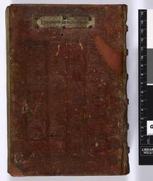 | Keywords: THEOLOGICAL and ethical compilations, viz.- Part 1. "Auctoritates pro virtutibus contra vitia" (so the modern title on the back) - a collection of biblical texts suitable for texts of sermon - Lower cover (Add Ms 38820).jpg Style Single tools design Romanesque; Caption Lower cover; Colour Red; Edge Unspecified exhibition history Decorative Technique Tooled in blind; Cover Material Sheep Contemporary binding of heep-skin dyed red over oak boards stamped in small square panels with fleurs-de-lys and heraldic beasts and birds within a narrow border of hippocamps with floriated tails On the lower cover is nailed a vellum label inscribed De viciis et virtutibus Note of ownership on f iv 14th cent Iste liber debet reverti ad conventum sancti Martini Tornacensis the Benedictine abbey of St Martin's Tournai Phillipps MS 2144 sale-cat 1896 lot 1065 Afterwards belonged to Henry White sale-cat 1902 lot 1964 Dunn sale-cat 1914 lot 1587 object history Text 13c; Unspecified; Unspecified object type Cc-zero place of creation Binding Not known place of discovery Unspecified British Library image http //www bl uk/catalogues/bookbindings/LargeImage aspx RecordId 020-000015344 ImageId ImageId 54811 Copyright BL THEOLOGICAL and ethical compilations viz Part 1 Auctoritates pro virtutibus contra vitia so the modern title on the back a collection of biblical texts suitable for texts of sermons a section de tempore and de sanctis including St Francis is at the end of pt ii ff 46-59 divided into five chief parts Vellum; ff viii + 225 71/2 in x 5 in Second half of XIII cent Uploaded with GWToolset THEOLOGICAL and ethical compilations viz Part 1 Auctoritates pro virtutibus contra vitia so the modern title on the back a collection of biblical texts suitable for texts of sermon - Lower cover Add Ms 38820 http //www webarchive org uk/bldatasets/bindings/Add38820_BC jpg Bookbinding 13th-century bookbinding British Library Bookbindings Taken with Phase One P45+ |