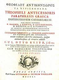 | Keywords: Theophili paraphrasis institutionum graeca - WIllhelm Otto Reitz - 1751.jpg en Theophili paraphrasis institutionum graeca Front page of the translation made by WIllhelm Otto Reitz Hague 1751 Theophili paraphrasis institutionum graeca Greek Θεόφιλου αντικήνσορος τα ινστιτούτα was a collection of byzantine legal texts from the time of Justinian I 5th/6th c composed by Theophilus the Antecessor el Θεόφιλου αντικήνσορος τα ινστιτούτα Πρώτη σελίδα της μετάφρασης του Βίλχελμ Όττο Ράιτς Χάγη 1751 Το Θεόφιλου αντικήνσορος τα ινστιτούτα ήταν μια συλλογή νομικών κειμένων α ό τον καιρό του Ιουστινιανού Α´ 5ος/6ος αιώνας τα ο οία συντάχθηκαν α ό τον Θεόφιλο τον Αντικήνσορα 2015-04-24 http //lawlibrary wm edu/wythepedia/index php/File TheophiliAntecessoris1751 jpg Wilhelm Otto Reitz other versions Custom license marker 2015 04 24 PD-old-100 Uploaded with UploadWizard Books in Greek Books in Latin |