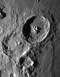 | Keywords: Theophilus 130924 01.jpg en Lunar craters Theophilus Cyrillus Imaged 2013 SEP 24 10 08 UT The Moon returns to the evening skies this week wending her way through the dim autumnal constellations as she waxes to First Quarter phase which occurs on the 10th at 12 57 am Eastern Standard Time Look for Luna ™s crescent above the dazzling disc of Venus in the southwestern sky at dusk on the 6th For the rest of the week she ™s pretty much on her own With little competition from other bright attractions this will be another good week to get to know the Moon ™s many interesting attractions Virtually any optical aid will transform her from a silver-flecked light in the sky to a place with stark sun-drenched landforms On the evening of the 8th point your telescope at the Moon to see one of my favorite lunar landmarks the prominent double crater pair of Theophilus and Cyrillus They will be very prominent about halfway between the cusps along the terminator line Theophilus is the fresher of the two craters with much of its ejecta blanket filling the floor of Cyrillus Theophilus is about 100 kilometers 61 miles in diameter and 3 3 kilometers 11 000 feet deep Its prominent central peak rises nearly 1 5 kilometers one mile above its floor As impressive as this crater may appear looks can be deceiving If you were able to stand on the floor of the crater about halfway between the terraced walls and central peak you would think you were on a vast flat plain Since the Moon is a much smaller sphere than the Earth your apparent horizon is much closer on the order of 1 5 kilometers one mile and the curvature of the surface drops away very quickly US Naval Observatory http //www usno navy mil/USNO/tours-events/sky-this-week/the-sky-this-week-2013-november-5-12 USNO Imaged 2013 SEP 24 10 08 UT Theophilus crater Cyrillus crater PD-USGov-Military-Navy |