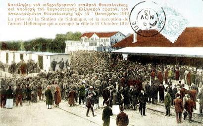 | Keywords: Thessaloniki train station 1912.jpg Occupation of Thessaliniki Railway Station by the Greek Army in 1912 Franked with a French Levant 5 c stamp cancelled on 1913-11-09 La prise de la Station de Salonique et la recption de l'Armée Héllénique qui a occupé la ville le 27 Octobre 1912 Postcard in G Megas archive<BR>http //www macedonian-heritage gr/HellenicMacedonia/en/img_D39j html<BR>http //www macedonian-heritage gr/HellenicMacedonia/media/original/d39j jpg ~ 1913 anonymous PD-Ottoman Empire First Balkan War Postcards of Greece Train stations in Thessaloniki Thessaloniki in the 1910s 1912 in the Ottoman Empire |