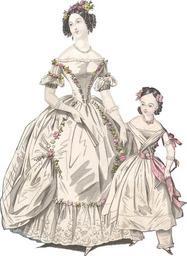 | Keywords: TheWorldOfFashionJanuary1838.jpg BALL DRESS FIG 2--Open robe of withe tulle over a white satin petticoat ; the latter is trimmed with a blond lace flounce which is headed by a wreath of flowers The robe is looped high at each side by a gerbe of flowers and trimmed by a wreath which extends to the waist A low corsage and short sleeves both decorated with flowers The hair disposed in ringlets at the sides and a full knot behind is adorned en suite YOUNG LADY'S DRESS FIG 3 --India muslin frock and pantaloons ; the corsage is trimmed with a fichu drapery and the sleeves with knots of ribbon Ceinture neck knot and hair knots en suite Source The World of Fashion; January 1838 Evening-wear The girl is wearing pantalettes PD-Art Fashion in 1838 Fans in art Mother and child in art Muslin dresses Pantalettes Flounces Females with white dresses in art Females with hair flowers in art Bows in hair Dresses with flower wreaths Ball gowns 1830s dresses Artworks missing infobox template |