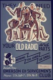 | Keywords: They Need Your Old Radio And Parts - NARA - 533886.jpg Scope and content General notes 533886 Local identifier 179-WP-28 Office for Emergency Management War Production Board 01/1942 - 11/03/1945 Still Picture Records Section Special Media Archives Services Division NWCS-S National Archives at College Park 8601 Adelphi Road College Park MD 20740-6001 ca 1942 - ca 1943 Record group Record Group 179 Records of the War Production Board 1918 - 1947 Record group ARC 508 War Production Board compiled 1942 - 1943 Series ARC 533858 File unit File unit ARC Variant control numbers NAIL Control Number NWDNS-179-WP-28 Other versions <gallery> File They_Need_Your_Old_Radio_And_Parts_-_NARA_-_533886 tif tif File They_Need_Your_Old_Radio_And_Parts_-_NARA_-_533886 jpg jpg </gallery> NARA-cooperation PD-USGov World War II posters from the United States Recycling in the United States in World War II |