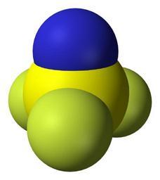 Keywords: Thiazyl-trifluoride-3D-vdW.png Space-filling model of the thiazyl trifluoride molecule NSF<sub>3</sub> Own 2007-10-12 Ben Mills Benjah-bmm27 - Images by Ben Mills Thiazyl trifluoride