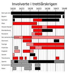 | Keywords: Thirty Years War involvement graph nn.svg <center> 5 border 0 - background f00; width 20px; Direkte mot keisaren - background ff8080; width 20px Indirekte mot keisaren - background 000; width 20px; Direkte for keisaren - background 999; width 20px; Indirekte for keisaren </center> en Translation to Nynorsk of SVGChart of states' participation in the Thirty Years' War Data has been obtained from Parker Geoffrey The Thirty Years' War 2nd edition Routledge London 1997 p 139 ISBN 0415128838 Inkscape Thirty_Years_War_involvement png 2010-01-04 19 43 UTC Thirty_Years_War_involvement png Foxhunt king derivative work Grandiose <span class signature-talk >talk</span> Thirty Years War |