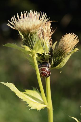 Keywords: thistle snail flower shell nature close blossom bloom invertebrates leaf green flora