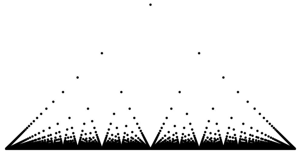 | Keywords: Thomae function (0,1).svg validSVG Thomae's function on the interval 0 1 Shown are all rational points with denominator at most 200 Created using the following Java code <source lang java > public class Thomae static int gcd int a int b while a>0 b>0 if a>b a - a/b b; else b - b/a a; return a>0 a b; public static void main String args int max 200; int width 1280; int height 660; int border 20; int x0 border; int x1 width - border; double dx x1-x0; int y0 height - border; double dy -dx; int r 5; System out println < xml version \ 1 0\ standalone \ no\ > ; System out println < DOCTYPE svg PUBLIC \ -//W3C//DTD SVG 1 1//EN\ \ http //www w3 org/Graphics/SVG/1 1/DTD/svg11 dtd\ > ; System out println <svg width \ + width + \ height \ + height + \ xmlns \ http //www w3 org/2000/svg\ version \ 1 1\ > ; for int q 1; q<max; q++ for int p 0; p<q; p++ if gcd p q 1 System out println <circle cx \ + x0+dx p/q + \ cy \ + y0+dy 1/q + \ r \ + r + \ fill \ black\ stroke \ none\ /> ; System out println </svg> ; </source> Own Smithers888 2008-10-09 Continuity functions |