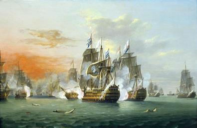 | Keywords: Thomas Luny - The Battle of The Saints.jpg between 1782 1837 oil panel cm 27 5 43 2 institution National Maritime Museum object history credit line <small>The Saints was the last major action of the American Revolutionary War fought near the islets called the Iles des Saintes just north of Dominica in the West Indies Admiral Sir George Rodney's victory over the French fleet of the Comte de Grasse foiled the latter's attempt to invade Jamaica and enabled Britain to secure her position in the West Indies by the treaty that ended the war in 1783 even though she lost her American colonies The battle is also famous as the point of origin of the tactic of 'breaking the line' which was achieved with great albeit accidental effect by Rodney in seizing an advantage created by a shift of wind as the fleets began the action The principal subject here is the clash of flagships of the two commanders-in-chief both seen from astern in port- quarter view The larger 'Ville de Paris' 110 guns flagship of de Grasse is fully seen in the centre on the left Admiral Sir George Rodney in the 'Formidable' 90 guns is engaging her to starboard on the right partly concealed although de Grasse eventually struck to his second-in-command Samuel Hood in the 'Barham' Rodney correctly flies the St George's cross at the main as an Admiral of the White but a red ensign rather than a white one This was his normal colour but he had specifically ordered the British fleet to fly red on this occasion to minimize confusion in action with enemy ships flying the white Bourbon colours of pre-Revolutionary France as shown on the 'Ville de Paris' There is an inscription identifying the action written by Luny in pen and ink on the back of the panel 'Adml Lord Rodney Engaging the French Fleet / Commanded by the Count de Grasse April 12th 1782 / T Luny' The signature is in the same form as he also used for painted signatures The back also bears stuck down the finely engraved trade card of Thomas Merle who was Luny's London selling agent from early in his independent career in the 1780s after he left the pupilage of Francis Holman He still had dealings with Merle until 1817 ten years after permanently moving to Teignmouth However while this picture is undated the colour and handling suggest it is relatively early The rectangular card has the text centred within a horizontal oval border At top centre this includes the device of a hanging key in a smaller vertical oval It reads ˜THOMAS hanging key MERLE / Successor to the late Mr Deerlove / Picture Frame Maker Carver Gilder Printseller / At the Golden Key No 36 Leadenhall Street / London / Makes Sells all sorts of Picture Frames Carves Gilds Looking / Glass Frames Girandoles in the neatest Taste at the most / Reasonable Prices Landscapes Sea Pieces neatly Painted / Pictures carefully cleaned lined mended / Old Frames new Gilt on the shortest / Notice / Mouldings of different Patterns Lengths for the conveniency of Export ™<ref>http //collections rmg co uk/collections/objects/12193 html ROYAL MUSEUMS GREENWICH</ref> reflist </small> accession number BHC0701 http //collections rmg co uk/collections/objects/12193 html ROYAL MUSEUMS GREENWICH PD-old-100-1923 Thomas Luny Battle of the Saintes Paintings in the National Maritime Museum London 18th-century sailing ships in paintings 18th-century oil on panel paintings 19th-century sailing ships in paintings 19th-century oil on panel paintings 18th-century paintings of naval battles 19th-century paintings of naval battles |