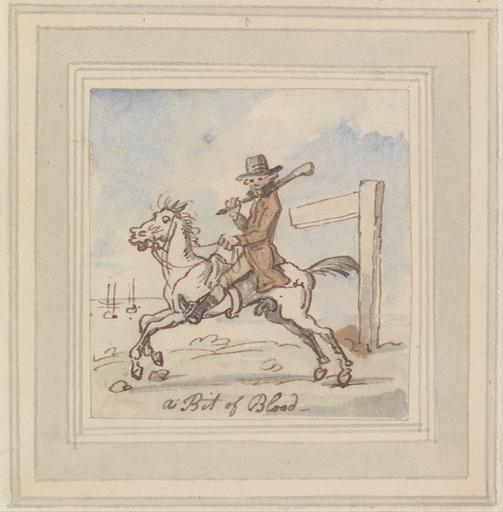 | Keywords: Thomas Rowlandson - A Bit of Blood - Google Art Project.jpg Inscribed in pen and gray ink lower center in artist's hand a Bit of Blood Inscription _Marks BUTTANSH letters; similar to shorter 21 and 22 Inscription _Signed_and_Dated Not signed not dated Not on View Watercolor with pen and red-brown ink and graphite on medium lightly textured beige wove paper riding crop horse animal red man bit bridle component hat riding coat genre subject special url_id uAGAQvpcSjAQtg PD-old-100-1923 1827 Drawings and watercolours by Thomas Rowlandson Google Art Project works by Thomas Rowlandson Male horses |