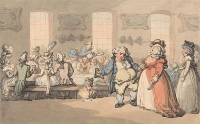 | Keywords: Thomas Rowlandson - The Comforts of Bath- The Breakfast - Google Art Project.jpg No inscription Inscription _Signed_and_Dated Not signed not dated Not on View Watercolor with pen and brown-gray and black ink over graphite on medium smooth blued white wove paper; mount border light blue medium slightly textured laid paper; gray and peach wash lines on mount dinner eating people by activity meal breakfast interior men women feathers windows hooks dining hall long tables hats fans genre subject special url_id GAHPkehWBEQ0PQ PD-old-100-1923 1827 Drawings and watercolours by Thomas Rowlandson Google Art Project works by Thomas Rowlandson |