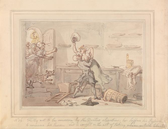| Keywords: Thomas Rowlandson - Kitty Overcome - Google Art Project.jpg  Google Art Project watercolor London 1756 London 1827 Thomas male 2332358 Rowlandson British 1756 - 1827 /collection/yale-center-for-british-art/artwork/kitty-overcome-thomas-rowlandson/2439121/ Thomas Rowlandson Artist /artist/thomas-rowlandson/4131603/ 4131603 /collection/yale-center-for-british-art/ Yale Center for British Art 2305845 http //britishart yale edu/ 2/23/2012 10 34 01 PM /collection/yale-center-for-british-art/artwork/kitty-overcome-thomas-rowlandson/2439121/ 1821 1821 dog animal cat domestic cat mouse youth elderly man women door steps shelves chair Table - mixing churn dishes genre subject Watercolor with pen and red-brown and brown ink over graphite with pen and gray ink and wash line on border on medium slightly textured cream wove paper 216 2439121 False 1821 3/24/2012 9 52 25 PM YCBA/lido-TMS-5702 http //collections britishart yale edu/vufind/Record/1670003 Yale Center for British Art Paul Mellon Collection painting 1820 1830 London Creation w279 x h216 cm 1821 False 1 30612244897959 Item kitty-overcome-thomas-rowlandson Kitty Overcome k 279 <nowiki>Inscribed in graphite on mount lower center N36 Kitty not to be overcome by the Doctors elocution - her suffers his passions to overcome his Reason and is caught in the act of taking unwarrantable liberties ; in pen in red brown ink verso lower center The Doctors Passions overcomes his reason and attempts unwarrant edge of paper Liberties with Kitty </nowiki> Inscription _Signed_and_Dated Not signed not dated Not on view Watercolor with pen and red-brown and brown ink over graphite with pen and gray ink and wash line on border on medium slightly textured cream wove paper dog animal cat domestic cat mouse youth elderly man women door steps shelves chair Table - mixing churn dishes genre subject special url_id wQG1BHzRJKL09Q PD-old-100-1923 1827 Drawings and watercolours by Thomas Rowlandson Google Art Project works by Thomas Rowlandson 1821 drawings Female toplessness in art |