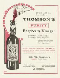 | Keywords: text Shows a bucket of raspberries being tipped into a very large bottle of Thomson's raspberry vinegar, made of raspberry juice and sugar. There is an exhortation not to "confuse Thomson's "Purity" cordials with cheap lines sold under the same name". Sole agents were: Ford & Mirams (Canterbury), Salmon & Spraggon (Wellington), and H E Gillespie (Auckland) Quantity: 1 colour photo-mechanical print(s) on pamphlet. Physical Description: Offset print on folded pamphlet, 297 x 230 mm. Provenance: Purchased from Barney Brewster, Nelson, in 2004. Thomson & Company (Dunedin) :Thomson's "Purity" raspberry vinegar. [ca 1910]. [Pamphlet advertising Methven boilers and pipes, Creamoata, Thomson's Purity Raspberry Vinegar, and Thomson's Purity Lime Juice. ca 1910].. Ref: Eph-B-RETAIL-1910-01-03. Alexander Turnbull Library, Wellington, New Zealand. natlib.govt.nz/records/22701749 Shows a bucket of raspberries being tipped into a very large bottle of Thomson's raspberry vinegar, made of raspberry juice and sugar. There is an exhortation not to "confuse Thomson's "Purity" cordials with cheap lines sold under the same name". Sole agents were: Ford & Mirams (Canterbury), Salmon & Spraggon (Wellington), and H E Gillespie (Auckland) Quantity: 1 colour photo-mechanical print(s) on pamphlet. Physical Description: Offset print on folded pamphlet, 297 x 230 mm. Provenance: Purchased from Barney Brewster, Nelson, in 2004. Thomson & Company (Dunedin) :Thomson's "Purity" raspberry vinegar. [ca 1910]. [Pamphlet advertising Methven boilers and pipes, Creamoata, Thomson's Purity Raspberry Vinegar, and Thomson's Purity Lime Juice. ca 1910].. Ref: Eph-B-RETAIL-1910-01-03. Alexander Turnbull Library, Wellington, New Zealand. natlib.govt.nz/records/22701749 |