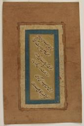 | Keywords: Three Bayts (Verses) on Worldly Desires WDL6859.png Artwork ru Т и бейта стиха о земных желаниях fr Trois bayts versets sur les désirs matériels en Three Bayts Verses on Worldly Desires zh 关于世俗欲 的三个诗节 pt Três bayts versos sobre os desejos mundanos ar ثلاثة أبيات عن الرغبات الدنيوية ru Данный каллиг афический ф агмент включает т и <em>бейта</em> стиха на пе сидском языке в кото ых в стихотво ной фо ме описывается истинное значение жизни В этом д евнем монасты е пост оенном в ста ые в емена / Ст анно что сущностью человека так п енеб егают / Если тебе суждено п овести всю жизнь в богатстве / Ты не узнаешь его ценности пока его не ут атишь / В этом доме из сандалового и че ного де ева / Иногда ца ит т ау а в д угие дни отмечают свадьбу В стихотво ном п оизведении ми п едставлен как д евний монасты ь и дом из сандалового и че ного де ева и кова ен он заби ает то что дает в нем соседствуют адости и печаль Истинную ценность человеческой жизни надо искать не че ез п иоб етение мате иальных ценностей Стихи написаны че ными че нилами ш ифтом насталик на бежевой бумаге и об амлены облакооб азными полосами на золотом фоне Текстовая панель об амлена синей и к емовой каймами ук ашенными золотыми к апинками и немного неакку атно наклеена на больший по азме у лист ко ичневой бумаги с ка тонной подложкой а данном каллиг афическом ф агменте нет ни даты ни подписи Однако возможно что он был выполнен в И ане или Индии в XVIII XIX веках <br>Каллиг афия пе сидская; Иллюмини ование укописей; Пе сидская поэзия; Поэзия fr Ce fragment de calligraphie comprend trois <em>bayts</em> versets de poésie en persan décrivant le vrai sens de la vie dans les versets suivants « Dans cet ancien monastère bâti autrefois / Il est étrange que la subsistance de l'homme soit si négligée / S'il devait passer toute sa vie avec des richesses / Il ne saurait pas leur valeur jusqu'à ce qu'elles soient perdues / Dans cette maison de bois de santal et d'ébène / Il y a parfois un deuil et parfois un mariage » Le poème décrit le monde comme un ancien monastère et une maison de bois de santal et d'ébène Le monde est traître car il reprend ce qu'il donne mais il consiste aussi conjointement en joies et tristesses La vraie valeur de la vue d'un homme doit être recherchée ailleurs que dans l'acquisition de biens matériels Les versets sont exécutés en écriture nastaliq à l'encre noire sur un papier beige Il sont soulignés par des bandes de nuages peintes sur un fond doré Le texte est encadré par des bordures bleues et crème décorées de mouchetures dorées Celles-ci furent collées sans soin sur une feuille plus grande de papier marron renforcée par du carton au dos Ce fragment de calligraphie n'est ni signé ni daté Cependant il pourrait avoir été exécuté en Iran ou en Inde aux XVIII<sup>e</sup>-XIX<sup>e</sup> siècles <br>Calligraphie persane; Enluminures; Poésie persane; Poésie en This calligraphic fragment includes three <em>bayts</em> verses of poetry in Persian that describe the true meaning of life in verses that read In this ancient monastery built in olden days / Strange that man's substance is so neglected / If he were to spend his whole life with riches / He would not know their value until they are lost / In this house of sandalwood and ebony / Sometimes there is mourning at others a wedding The poem describes the world as an ancient monastery and a house of sandalwood and ebony The world is treacherous as it takes back what it gives but also consists jointly of joys and sadness The true value of man's life must be sought elsewhere than in the acquisition of worldly goods The verses are executed in black Nasta'liq script on beige paper and are outlined in cloud bands on a background painted in gold The text panel is framed by blue- and cream-colored borders decorated with gold flecks and somewhat sloppily pasted to a larger sheet of brown paper backed by cardboard This calligraphic fragment is neither signed nor dated However it may have been executed in Iran or India in the 18th 19th centuries <br>Calligraphy Persian; Illuminations; Persian poetry; Poetry zh 这幅书法残卷包含三 <em>bayts</em>(句)波斯语诗歌,描述了生活的 实意义,文中写道: 这个建于昔日的古 修道院里,/奇 的是,人的物质显得如此不重要 /如 他富裕 度过 生,/他不会知道财富的价 ,除 失去它们 / 这个 香和乌 建 的房子里,/ 时( ) 悼声, 时是欢乐的婚礼 这首诗将世界描述成 座古 的修道院和 用 香和乌 建 的房子 世界变化莫测,因为它会把给予的 切全部收回,这既 欢乐,也 悲伤 生命的 正价 必须 获得世俗物质之外寻找 此诗歌以黑色波斯体书写 张米色的纸张上,以带状云彩图案勾勒,背景涂成金色 字幅的 色和奶油色边框装饰 金色斑点, 些随意 粘贴到 张更大的棕色纸张上,背衬 纸 这幅书法残卷既没 署名也没 