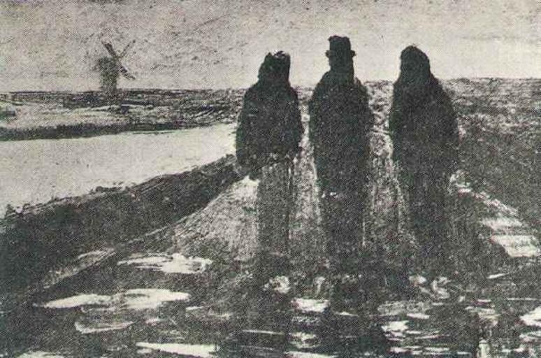 Keywords: Three Figures near a Canal with Windmill.jpg es Pintura estancia en La Haya http //www vggallery com/ VG Gallery Van Gogh August 1883 Van Gogh 1881-83 The Hague PD-old