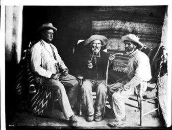 Photograph of a group portrait of three Mexican Indian fighters at the pueblo of Ciboletta, New Mexico, ca.1900. They sit on wooden chairs inside. All three wear hats. The man at left is sitting on a chair covered with an Indian blanket. The man in the middle is smoking a long pipe and holding a cane. The man at right has a holster attached to his belt. A blanket hangs behind the group.