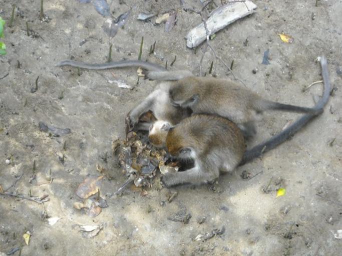 Three long-tailed macaques eating horseshoe crab.jpg (640x480)