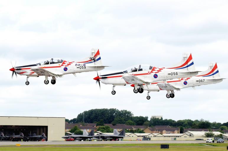 | Keywords: Three Pilatus PC-9 arrive RIAT Fairford 7July2016 arp.jpg Three of the six Pilatus PC-9M aircraft of the Croatian Air Force aerobatic display team 'Krila Oluje' arrive at the 2016 Royal International Air Tattoo Gloucestershire England In the hangar are three F-35 Lightnings and outside two F-22 Raptors My own photo taken with a Nikon D5300 DSLR and Tamron 70-300 lens Taken 7th July 2016 Myself Adrian Pingstone arpingstone Pilatus PC-9 at the 2016 Royal International Air Tattoo Krila Oluje Taken with Nikon D5300 |