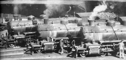 Keywords: train railway tasmania blackandwhite monochrome steam engine locomotive vehicle black and white servicing at Hobart roundhouse. The Mercury photo servicing at Hobart roundhouse. The Mercury photo