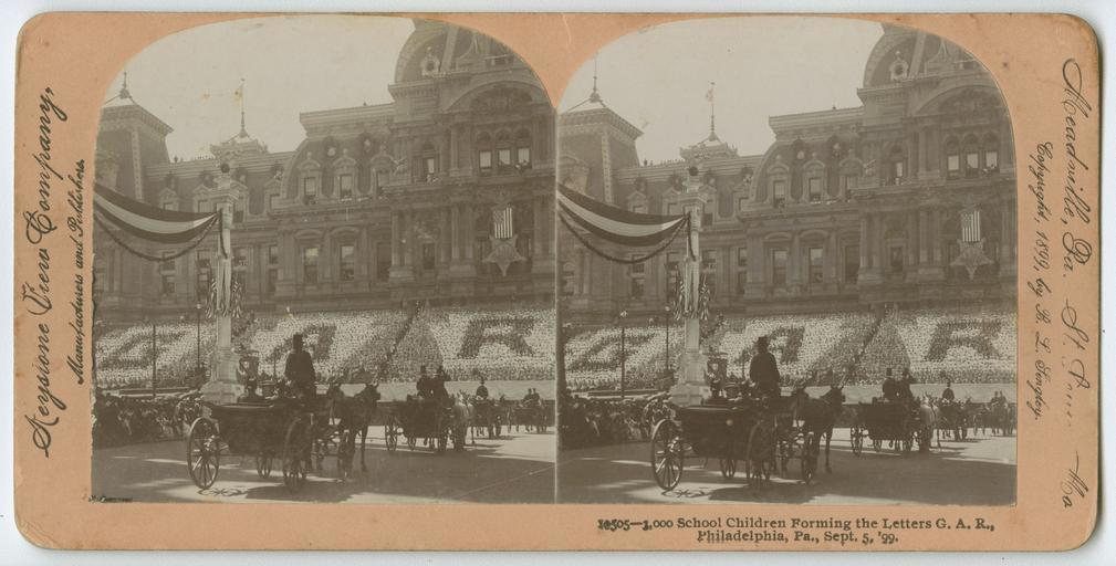 Keywords: stereographs philadelphia grand army of the republic reunion grandarmyoftherepublicreunion children parades city hall cityhall broad street broadstreet Shows three thousand school children gathered for the Grand Army of the Republic Reunion celebrations in Philadelphia, 1899. The children are arranged in the formation of the letters "G" "A" and "R" in front of City Hall, facing Broad Street. G.A.R. members parade in carriages toward the children. A crowd watches from the periphery. Accession number: P.2011.47.1587 Shows three thousand school children gathered for the Grand Army of the Republic Reunion celebrations in Philadelphia, 1899. The children are arranged in the formation of the letters "G" "A" and "R" in front of City Hall, facing Broad Street. G.A.R. members parade in carriages toward the children. A crowd watches from the periphery. Accession number: P.2011.47.1587