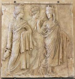 | Keywords: Three tyches Louvre Ma590.jpg Relief known as the three Tyches ”Tyche is the Greek goddess of Fortune; since the Hellenistic period each city has its own Tyche represented with a crown of ramparts This relief found at the Via Appia is known since the 18th century and belonged to the Borghese collections It may come from the Triopius the funeral complex built by Herodes Atticus for his wife Annia Regilla Bas-relief dit « des trois Tychés » Tyché est la déesse grecque de la Fortune Depuis l'époque hellénistique chaque cité possède sa propre Tyché représentée avec une couronne de remparts Ce bas-relief découvert le long de la Via Appia est connu depuis le XVIIIe siècle et a appartenu aux collections Borghèse It pourrait provenir du Triopius le complexe funéraire élevé par Hérode Atticus en l'honneur de sa femme Annia Régilla ca 160 AD marble cm 88 5 83 12 5 Institution Louvre object department Greek Etruscan and Roman antiquities room ID 158 28632 object history credit line Borghese Collection accession number Ma 590 MR 873 own photo date 2006 Marie-Lan Nguyen artwork license PD-old-100 photo license other versions Roman antiquities in the Louvre - Room A Ancient Roman reliefs in Paris Tyche Annia Regilla 160s Borghese Collection Mural crowns in art Ancient roman sculptures from Via Appia |