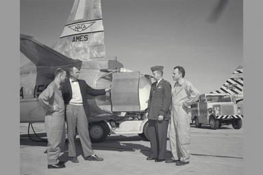 | Keywords: naca nasa nasa ames research center nasaamesresearchcenter george cooper georgecooper 1958 Description: Ames Chief test pilot George Cooper discusses phases of flight evaluation tests. NACA personnel (l to R) Air Force Major E. Sommerich; Ames Engineer Seth Anderson, Lt. Col. Tavasti; and George Cooper pose in front of the thrust reverser on F-94C01. Note: Used in publication in Flight Research at Ames; 57 Years of Development and Validation of Aeronautical Technology Image #: Date: May 21, 1958 Description: Ames Chief test pilot George Cooper discusses phases of flight evaluation tests. NACA personnel (l to R) Air Force Major E. Sommerich; Ames Engineer Seth Anderson, Lt. Col. Tavasti; and George Cooper pose in front of the thrust reverser on F-94C01. Note: Used in publication in Flight Research at Ames; 57 Years of Development and Validation of Aeronautical Technology Image #: Date: May 21, 1958 |