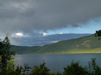 Keywords: thunderstorm canim lake british columbia canada scenery landscape weather glowing mountains water hills scenic nature dark clouds dramatic light