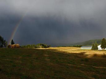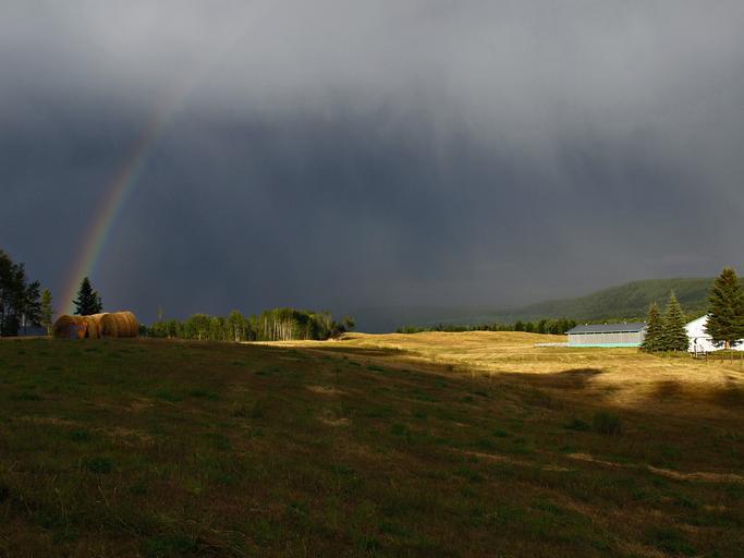 Keywords: thunderstorm rainbow field landscape farm summer hay rolls dark clouds british columbia canada forest grove town
