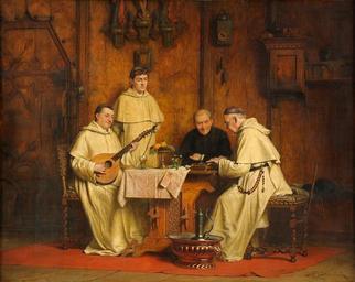 | Keywords: Thure Cederström Ein musikalisches Duo.jpg Mönche bei Tisch einer eine Laute ein anderer eine Zither spielend Th Cederström signature lower right oil on canvas 58 x 72 cm http //www duesseldorfer-auktionshaus de/ Düsseldorfer Auktionshaus by 1924 Thure Cederström 1843 “1924 PD-old Images from Düsseldorfer Auktionshaus Thure Cederström 1624 Paintings of monks Lutenists in art Zither players in art Anti-clerical art Men in rooms in art 1924 paintings 20th-century paintings of musicians |