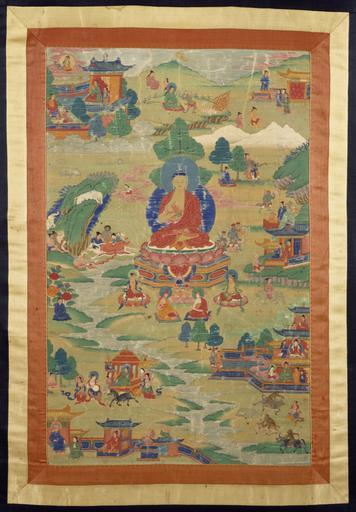 | Keywords: Tibetan - Buddha Shakyamuni with "Jataka" Tales - Walters 35140.jpg The Buddha Shakyamuni who lived in the 6th-5th century BC is here shown telling stories of his previous existences all of which he remembered and many of which he related to his disciples At left for instance the Buddha-to-be is an elephant who jumped to his death from a cliff so that people could feast on his body At bottom right he is a wild buffalo who explains that he will not seek revenge on a monkey that had tormented him late 17th-early 18th century watercolor cotton Extreme outside cm 131 5 66 3 ; Image cm 65 7 42 3 accession number 35 140 12985 John and Berthe Ford Baltimore date and mode of acquisition unknown Walters Art Museum John Berthe Ford 1987 place of origin Tibet Walters Art Museum license 2D Tibetan art in the Walters Art Museum Paintings from Tibet Paintings in the Walters Art Museum Jataka Paintings of Life of Gautama Buddha |