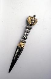| Keywords: Tibetan - Ritual Dagger - Walters 52311 (2).jpg Originally the phur-bu was probably a simple peg used to secure tent ropes to the ground No doubt the ability of the peg to pierce gave rise to the expression kilaya kilaya pierce pierce often a component of tantric mantras along with han han destroy destroy or maraya maraya kill kill The objects of destruction are of course enemies of the faith evil forces as well as psychic demons This example typically Tibetan in form is particularly handsome and visually powerful It has a three-sided iron blade adorned with silver intertwined serpents and a golden makara mythical aquatic creature guarding the joint of the hilt and the blade Then a silver thunderbolt with sixteen prongs has two knots of immutability at the two ends The finial has three wrathful heads with open mouths and hanging tongues crowned by prongs of yet another thunderbolt The square faces of the deity are particularly expressive with their strongly molded features and a rich interplay of gilt silver inlay and lightly applied pigments century 16 iron silver gold cm 32 4 accession number 52 311 38627 John and Berthe Ford Baltimore date and mode of acquisition unknown Walters Art Museum John Berthe Ford 2002 Desire and Devotion Art from India Nepal and Tibet in the John and Berthe Ford Collection The Walters Art Museum Baltimore; Birmingham Museum of Art Birmingham; Santa Barbara Museum of Art Santa Barbara; Albuquerque Museum Albuquerque 2001-2003 place of origin Tibet <gallery> File Tibetan - Ritual Dagger - Walters 52311 jpg </gallery> Walters Art Museum license Tibetan art in the Walters Art Museum Metalwork of Tibet Phurba |