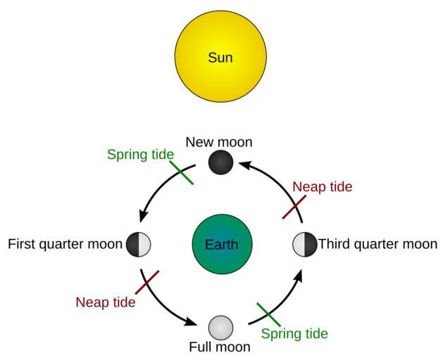 | Keywords: Tide schematic.svg en Tides schematic Due to the bathymetry of some areas neap and spring tides reach their maximum force 2 days after the first quarter moon third quarter moon and new moon full moon respectively In the absence of complications due to bathymetry spring tides are exactly at the full and new moons and neap tides are exactly at the one-quarter and three-quarter moon Every six hours the water also lowers or heightens; as such four tides are created Low water spring tide<br/> High water spring tide<br/> Low water neap tide<br/> High water neap tide 2009-10-06 Public domain image File Tides schematic JPG which was based on an image in Leidraad voor het Stuurbrevet by Richard Vooren Paul Van den Keybus User KVDP SVG conversion by Surachit Other versions <gallery> Esquema-mareas svg language es Tide schematic de svg language de Tide schematic mk svg language mk </gallery> Original jpg drawing File Tides schematic JPG Other fields + Diagrams Tides Tides |