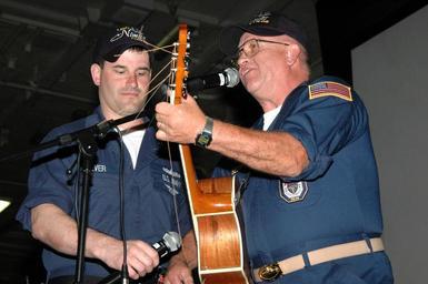 | Keywords: Tiger Cruise Talent Show DVIDS59756.jpg en Larry Seever a retired Navy chief performs a song with some help from his son Petty Officer 2nd Class Shawn Seever during the Tiger Cruise Talent Show Sept 25 aboard nuclear-powered aircraft carrier USS Nimitz CVN 68 Nimitz Strike Group and embarked Carrier Air Wing CVW 11 are returning to their homeport of San Diego after a six-month deployment 2007-09-25 Petty Officer 2nd Class Kristen Allen https //www dvidshub net/image/59756 070925-N-+++++-080 2007-09-28 11 37 USPACOM AT SEA PD-USGov-Military-Navy USS Nimitz CVN-68 Images from DoD uploaded by Fæ |