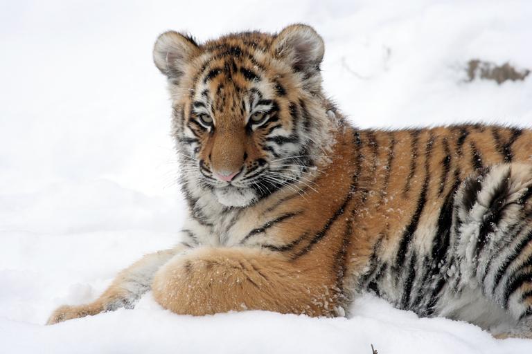 Keywords: tiger cub tiger reclining snow winter zoo big cat predator stripes young wildlife feline endangered fur nature mammal hunter powerful carnivore