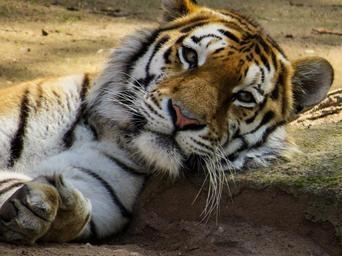 Keywords: tiger head cat close eyes tired rest zoo relaxation