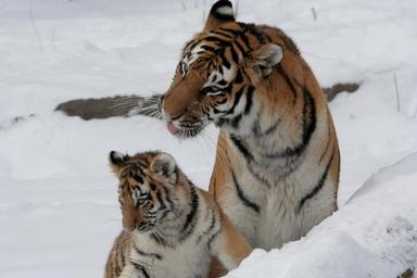 Keywords: tiger mother cub snow big cats predator wildlife stripes zoo fur feline hunter winter nature mammal female young