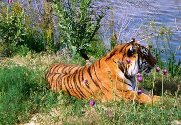 Keywords: tiger water vegetation wild life cat animal resting fur carnivore feline striped orange