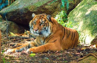 Keywords: tigers animals mammals wildlife resting relaxing brown furry black stripes striped dangerous forests rocks carnivorous hunters
