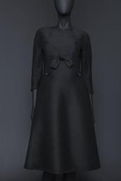 | Keywords: Till boken - utställningen Kunglig Vintage - Livrustkammaren - 87637.tif Klänning i svart ull med trekvartslång ärm Lös svart ärmlös foderklänning i svart siden eller viscose Ganska stora svarta urgröpta knappar av plast Klänningstyget är vävt i någon sorts satinbindning fast vågrät sådan väften är av någon sorts hård ull behöver inte vara får eller syntet och är de trådar som är synliga från rätan Varpen ser ut att vara syntet eller siden den är gles och ser ut att bara vara där för att fästa väften Klänningen är knälång och något utställd Knäpps med dragkedja i ryggen dekorerad med rosett på bröstet och har fuskknapphål och knappar på höften Den har trekvartslånga kimonoärmar <br/>Klänningens övre del och ärmar är i ett och samma stycke fram och i två stycken bak för isättning av dragkedja Halsen är högt skuren Framstycket är avskuret ovanför bysten och går ner i ett mjukt V på bysten Bakstyckerna har en mer rak linje över ryggen dock något buktande neråt mot mitter och har två insnitt för axeln mot halsen nära axelsömmen Nederdelen av klänningen Sidsömarna är något bakåtflyttade går in i midjan och ut något från stussen och ner till fåll Framstyckets nederdel som är format efter det mjuka V -et har längsgående bystinsnitt som börjar några cm ner från denna skärning mitt på bystens högsta punkt och går sen snett ner mot sidsömmens fåll och slutar 1 cm från den Under bysten mellan dessa insnitt går en söm som kapar av V -ets vassa del där är sedan placerad en rosett Denna rosett är gjord på följande sätt Tyget är vändsytt som en tunnel där ändarna endast är invikta och sedan pressade Denna har man sedan slått en knut på Strax under midjan någon cm från insnittssömmen sitter på mittstycket två paspoalerade knapphål med en liten skylt under och en knapp dessa har alltså ingen funktion utan är bara till för prydnad Bakstyckets nederdel är i två delar med en för hand påsydd dragkedja mitt bak och hyska och hake i halsen mittbaksömmen går ut något från midjan och ner till fållen Dom har två längsgående insnitt för midjan från den söm som skiljer överdel och underdel från varann till stussen Alla sömsmåner är kastade för hand och så även fållar nertill och i ärmarna På fållen nertill har man sytt på ett stycke sidenfoder kanske har man lagt ner klänningen eller så har tyget inte räckt Klänningens överdel med ärmar är dubbelsydd med svart organza och ett foder i syntet eller linneliknande tyg över axlarna är på sytt mot halsringningen En ärmlös underklänning i svart fodertyg av siden eller viskos är fastsydd med endast 4 trådtrensar ursprungligen 5 mot halsringningen en på var sida om dragkedjan en i var axelsöm och en mitt fram som lossnat Underklänningen har maskinkastade sömsmåner infodringar dragkjedja hyska och hake allt ligger mot kroppen På denna är två ettiketter fastsydda på vänster sida i bakhalsen sitter en svart med vit text H M Drottningens hovleverantör MÄRTASKOLANS FRANSKA AVDELNING STOCKHOLM Och på höger sida sitter en vit med svart text IRENE DANA 6 rue Chambiges PARIS original caption Till boken / utställningen Kunglig Vintage <br/> Nyckelord Kunglig Vintage Klänning Svart Ylle Rosett 1950-tal Föremålsbild decade 1950 woollen Färg svart d1 - dräkt - yttermaterial material ylle size cm 107 liv mitt bak size cm 125 kjol LRK Margaretha fru Ambler Kunglig Vintage 2011-2012 Livrustkammaren Kunglig Vintage Kalmar slott 2013 Kalmar slott place of origin original filename lm_dig6793 68741 inventory number LRK 32111 87637 CC-BY-SA Erik Lernestål Erik Lernestål Black 1950s fashion Media contributed by LSH dim-with multiple size templates Media contributed by LSH unmatched creator Media contributed by LSH unmatched keyword Color images from Livrustkammaren 20th century clothing in Livrustkammaren Media contributed by LSH 2013-10 |