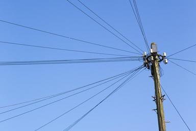 Keywords: timber telegraph pole old ceramic isolators old step irons overhead cables blue sky