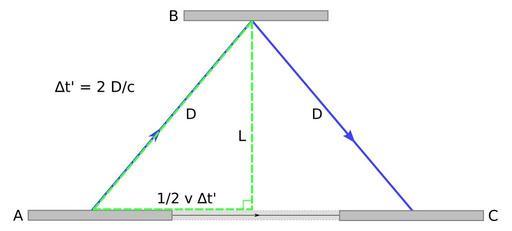 | Keywords: Time-dilation-002.svg The clock as observed in a frame where it is moving at some speed 'v' In this case the photon traces out a triangular path which is longer than in the rest frame But since the speed of light is the same in all frames this necessarily leads to a lengthening of the period of the clock as derived in the image SVG version of the original Image Time-dilation-002 jpg en wikipedia Hansmuller 2006 01 13 first version ; 2007 12 31 last version Mdd4696 wikipedia en Mdd4696 Original upload log page en wikipedia Time-dilation-002 svg 2007-12-31 11 07 DVdm 1000×450× 18513 bytes <nowiki>Correction</nowiki> 2007-12-31 11 05 DVdm 1000×450× 18513 bytes <nowiki>Delta notation to conform with rest of article and to avoid confusion with twin picture</nowiki> 2006-01-13 03 05 Mdd4696 1000×450× 17204 bytes <nowiki>Swapped A and B</nowiki> 2006-01-13 02 32 Mdd4696 1000×450× 17204 bytes <nowiki>The clock as observed in a frame where it is moving at some speed 'v' In this case the photon traces out a triangular path which is longer than in the rest frame But since the speed of light is the same in all frames this necessarily leads to</nowiki> Special relativity |