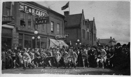 | Keywords: sports running races times-journal timesjournal fort william fortwilliam thunder bay thunderbay newspapers media businesses the t. & h. cafe thethcafe imperial cafe imperialcafe may street maystreet runners recreation leisure ontario canada history blackandwhite monochrome outdoor black and white Date: 24 May 1911 Description: Black and white postcard of the 1911 Times-Journal Road Race, moments after the starting gun was fired. The name of the winner is obscured, but the time was 54 minutes, 50 seconds. The T & H Cafe and Imperial Cafes can be seen in the background. Accession No.: 983.30.23 A Date: 24 May 1911 Description: Black and white postcard of the 1911 Times-Journal Road Race, moments after the starting gun was fired. The name of the winner is obscured, but the time was 54 minutes, 50 seconds. The T & H Cafe and Imperial Cafes can be seen in the background. Accession No.: 983.30.23 A |