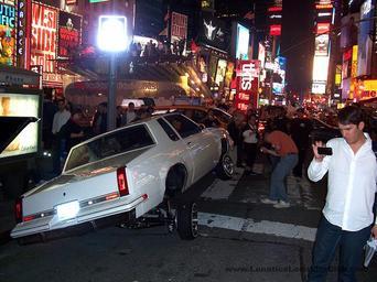 Keywords: Times Square car crash.jpg en Dirty's 1983 Chromed out Cutlass Supreme on 3 wheel in Midtown Manhattan Own Mikehalo512 circa summer 2009 cutlass lowrider chrome suspension lunatics nyc lowrider club Oldsmobile Cutlass A/G-body Times Square